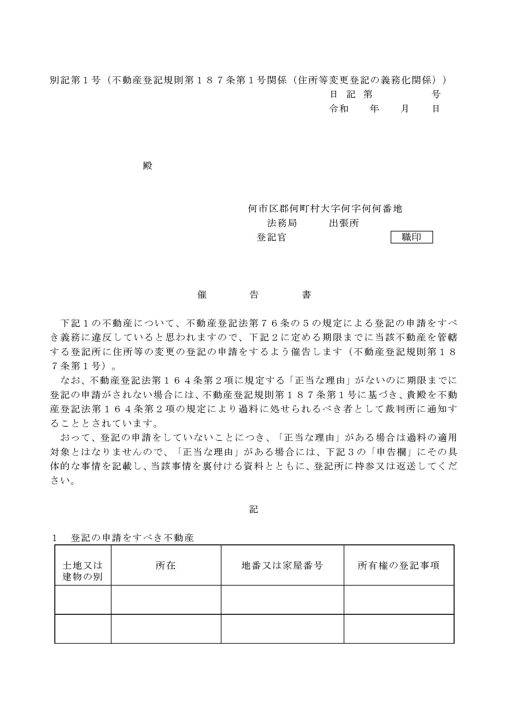 住所を移転したにも関わらず、正当な理由なく住所変更登記を怠ると、5万円以下の過料に処されます。この過料手続は、最終的に裁判所によって行われますが、その前提として、まず管轄法務局より違反者に対し、以下の画像の催告書が書面にて届きます。